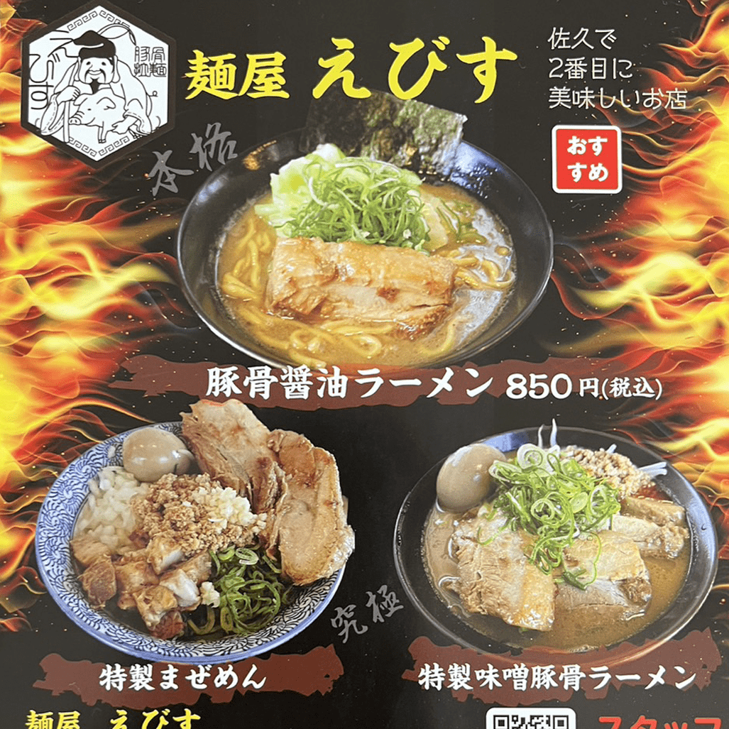 長野県佐久市の豚骨専門ラーメン店「麺屋えびす」は、老若男女問わず全ての方が気軽に来店できるラーメン店です。佐久平駅からも車で3分とアクセスが良いところにございます。