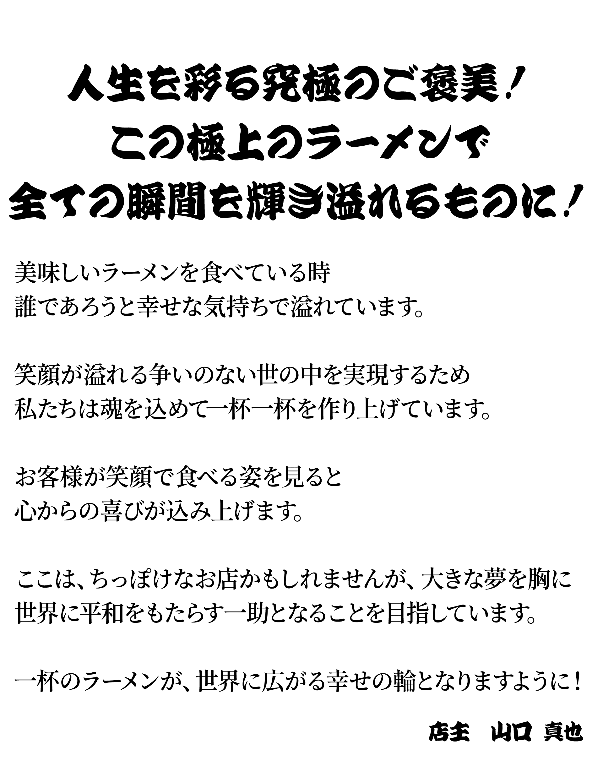 1人1人のお客様を大切に、居心地の良い店を心掛けています。「また来たい!」と思って頂けるようなラーメン屋を目指しスタッフ一同、ご来店をお待ちしております。